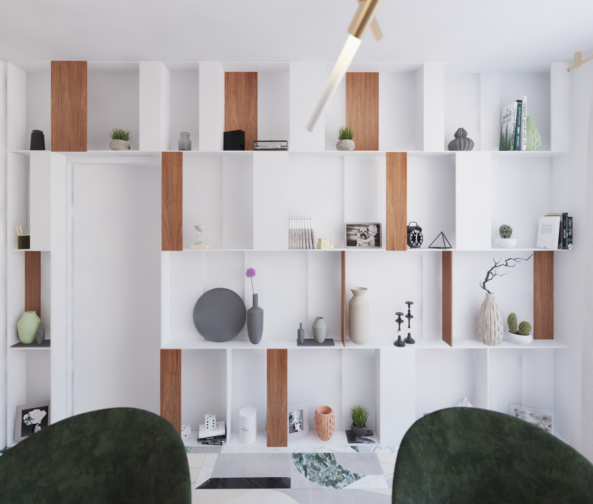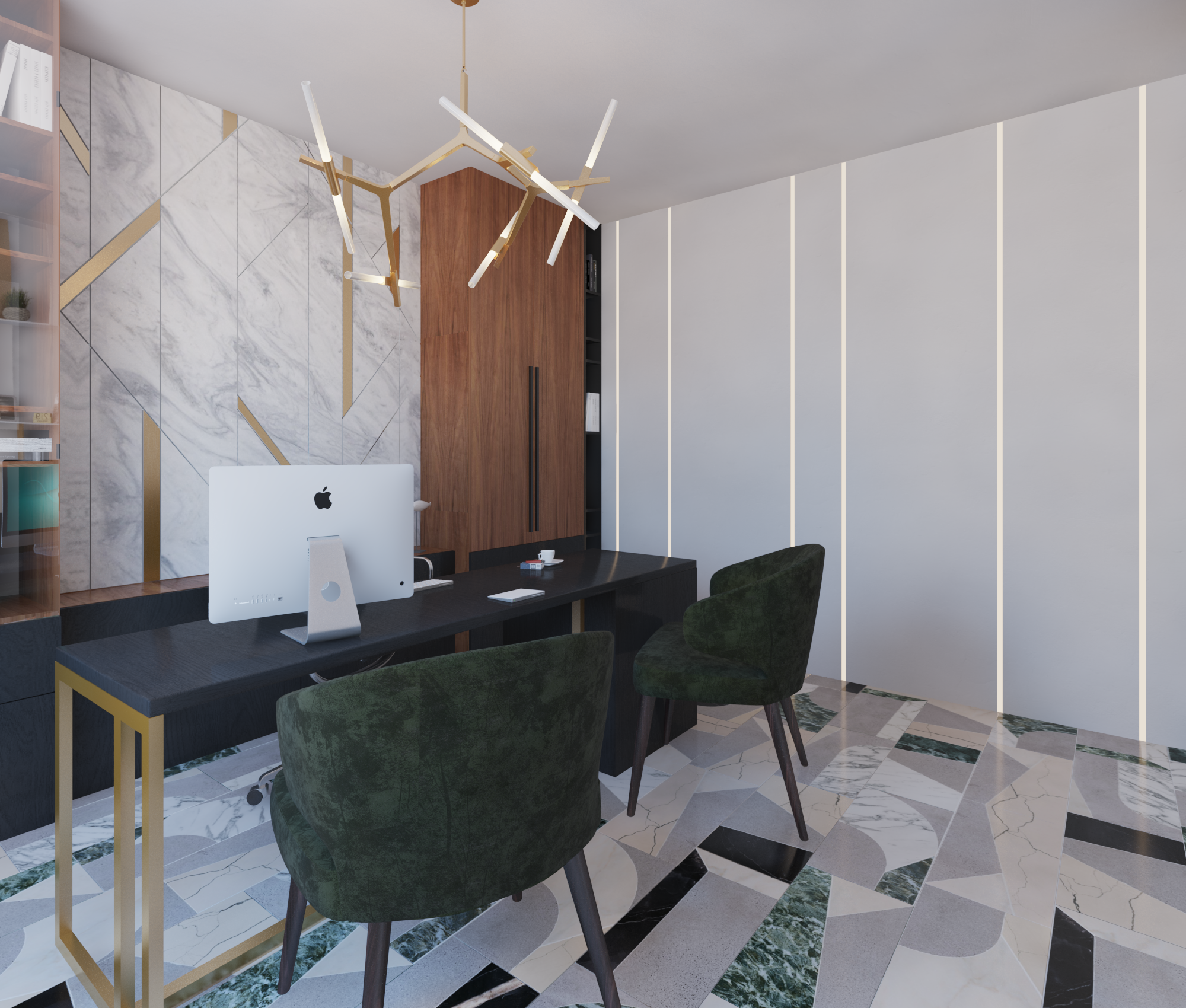 Un birou de acasa unde eleganta intalneste functionalitatea intr-o compozitie sofisticata. Marmura verde, cu venaturi expresive, aduce prospetime si un aer aristocratic, in timp ce accentele aurii — discrete, dar esentiale — completeaza cu o nota luxoasa si calda.
